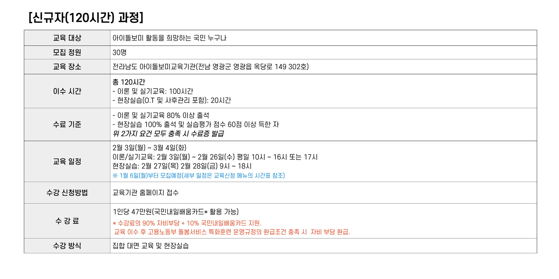 ※ 국민내일배움카드 활용(자비 부담 훈련비 환급 과정)을 원할 경우 교육 신청 전 국민내일배움카드 발급 필수.(가까운 고용센터 혹은 인터넷 HRD-net에서 발급 신청 가능)