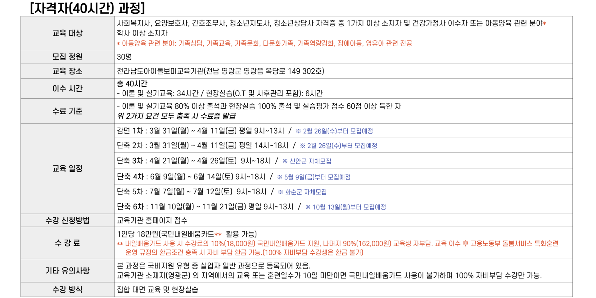 교육기관 소재지(영광군) 외 지역에서의 교육 또는 훈련일수가 10일 미만이면 국민내일배움카드 사용이 불가하며 100% 자비부담 수강만 가능합니다.